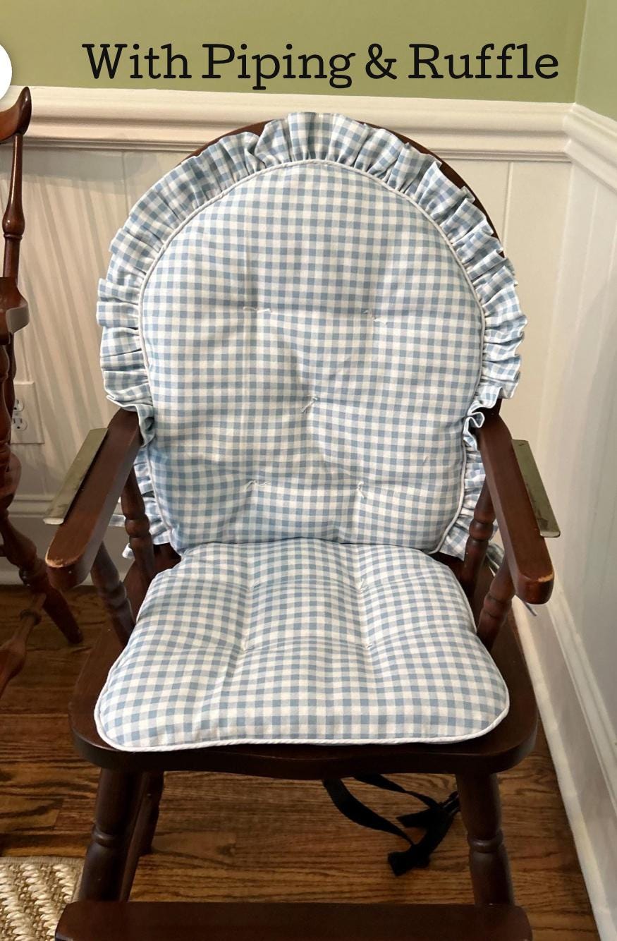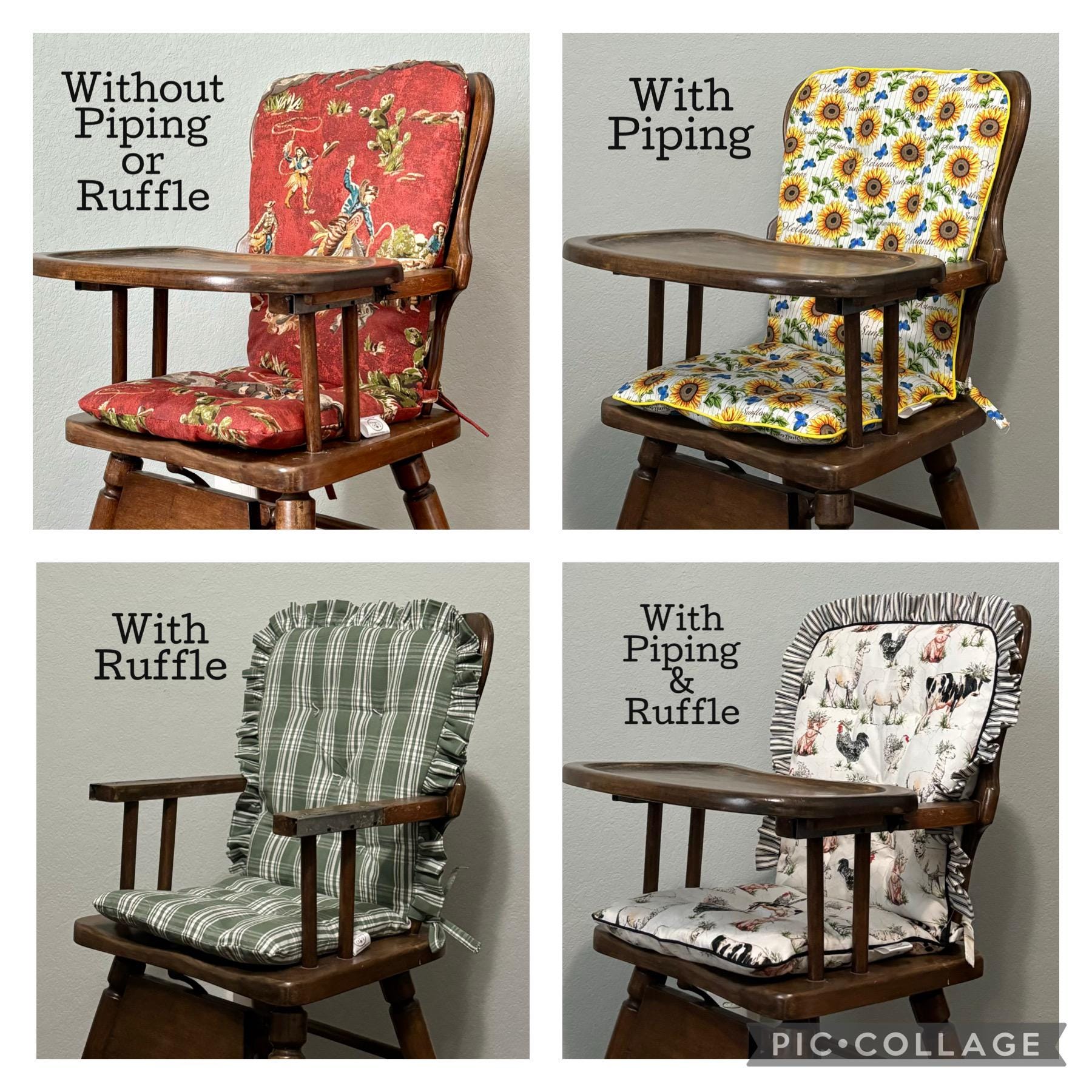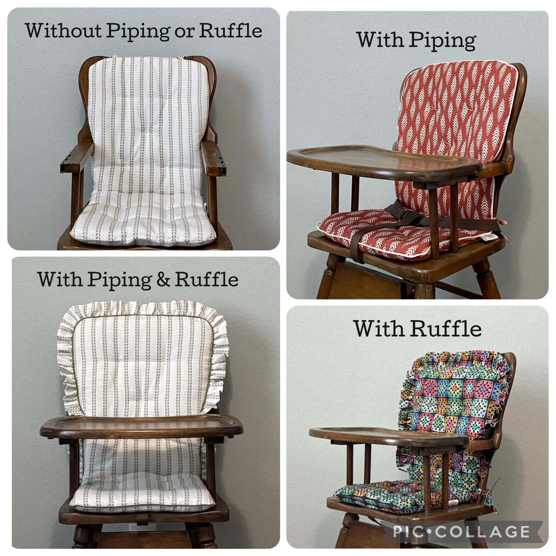 Custom, made to order cushions for your vintage wooden highchair in your choice of fabrics. Choose from otional piping, ruffle, or both! 68 fabrics to select from. Don’t see a fabric you like? Contact me and I will help find the perfect fabric to coordinate with your home decor. Or, you may send me one yard of your own fabric.