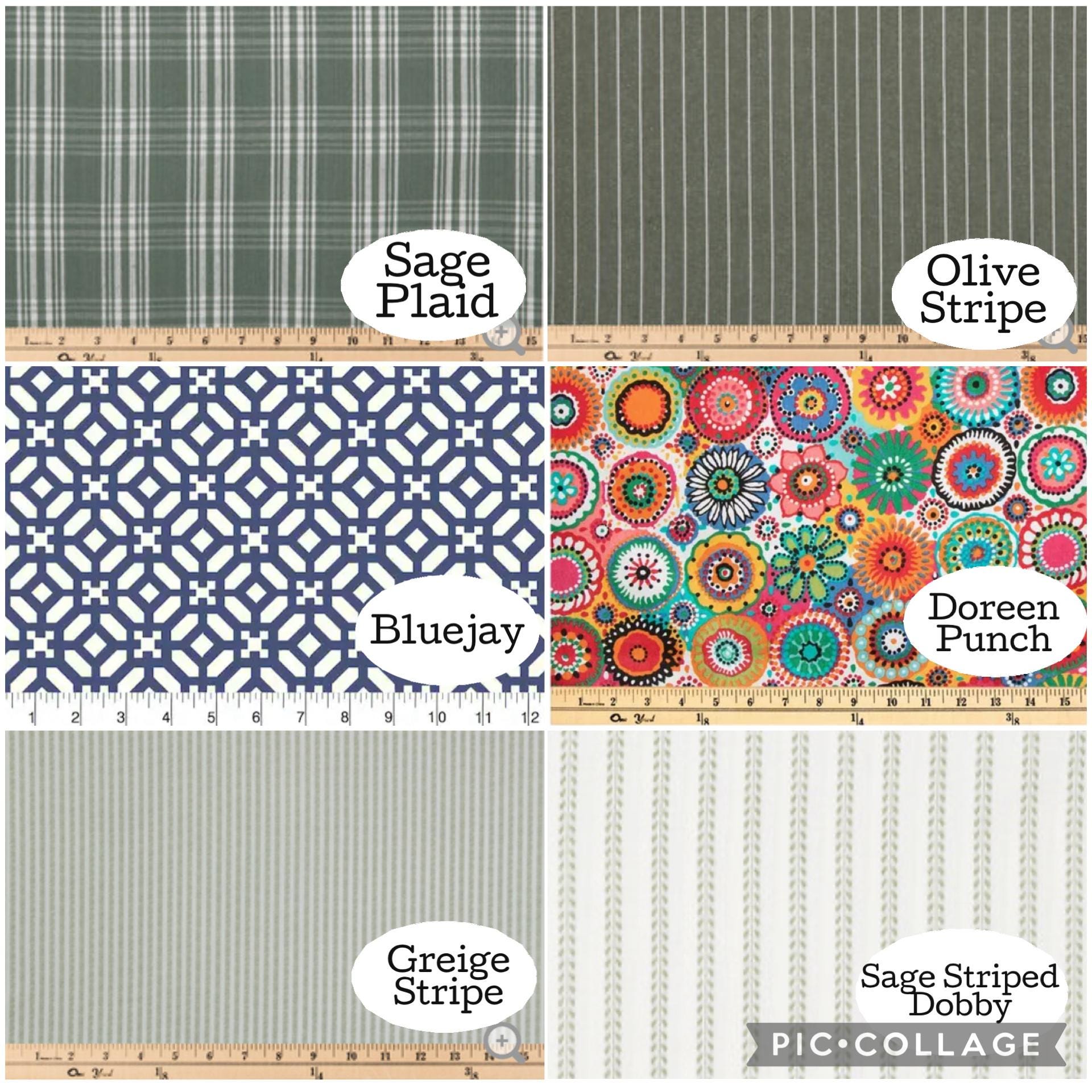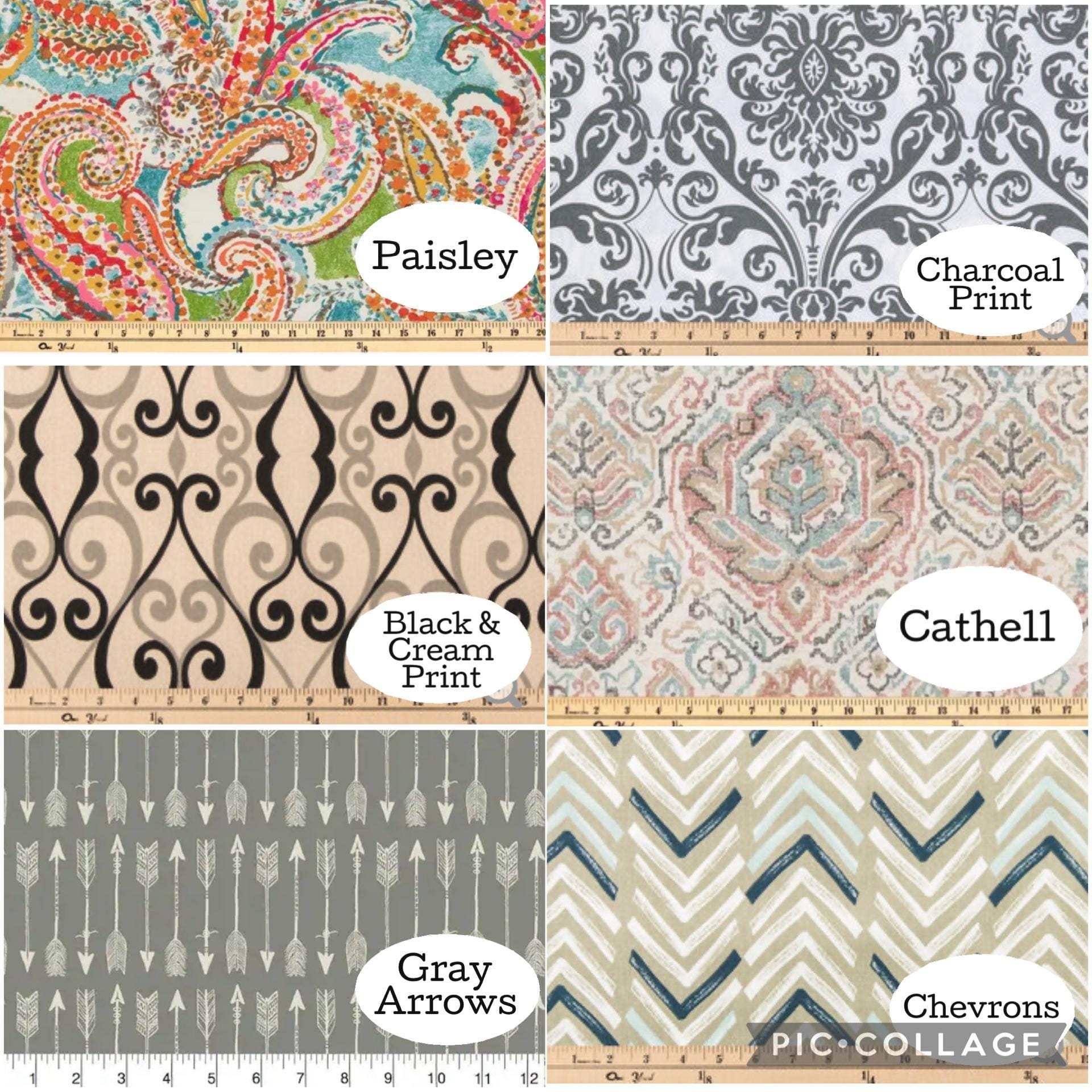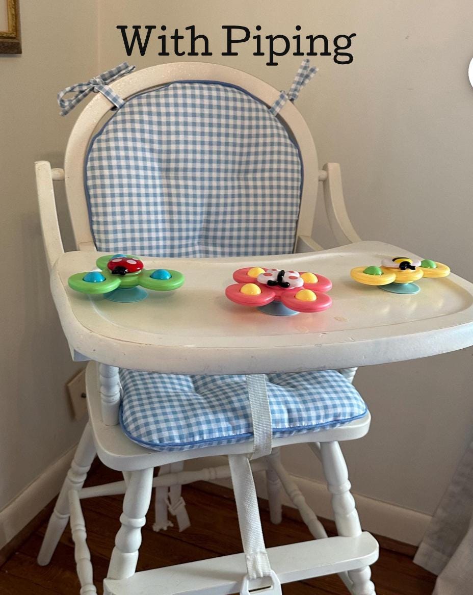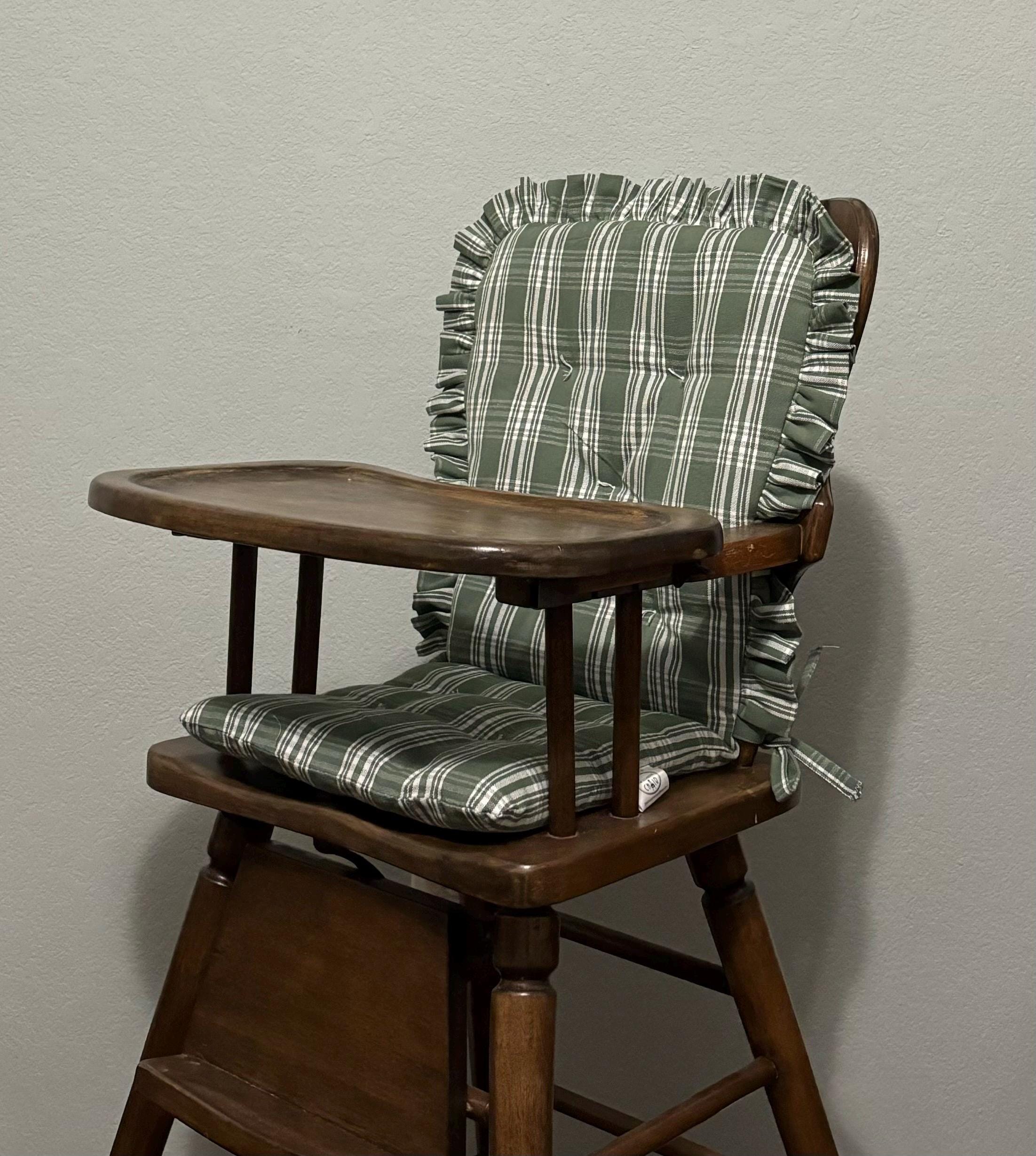 Custom, made to order cushions for your vintage wooden highchair in your choice of fabrics. Choose from otional piping, ruffle, or both! 68 fabrics to select from. Don’t see a fabric you like? Contact me and I will help find the perfect fabric to coordinate with your home decor. Or, you may send me one yard of your own fabric.