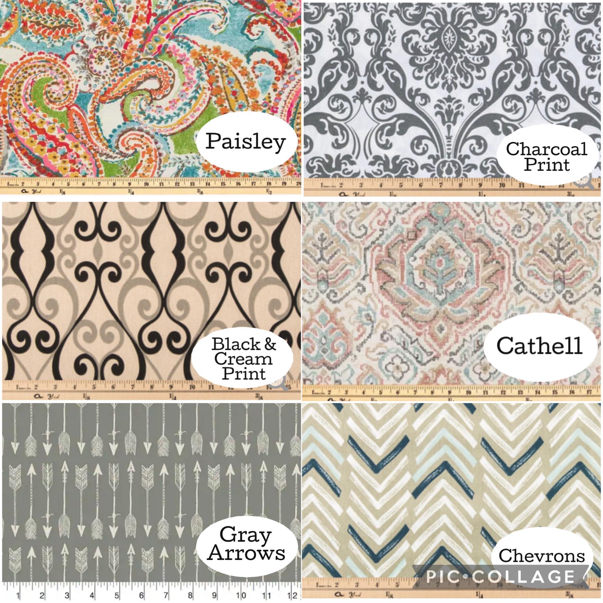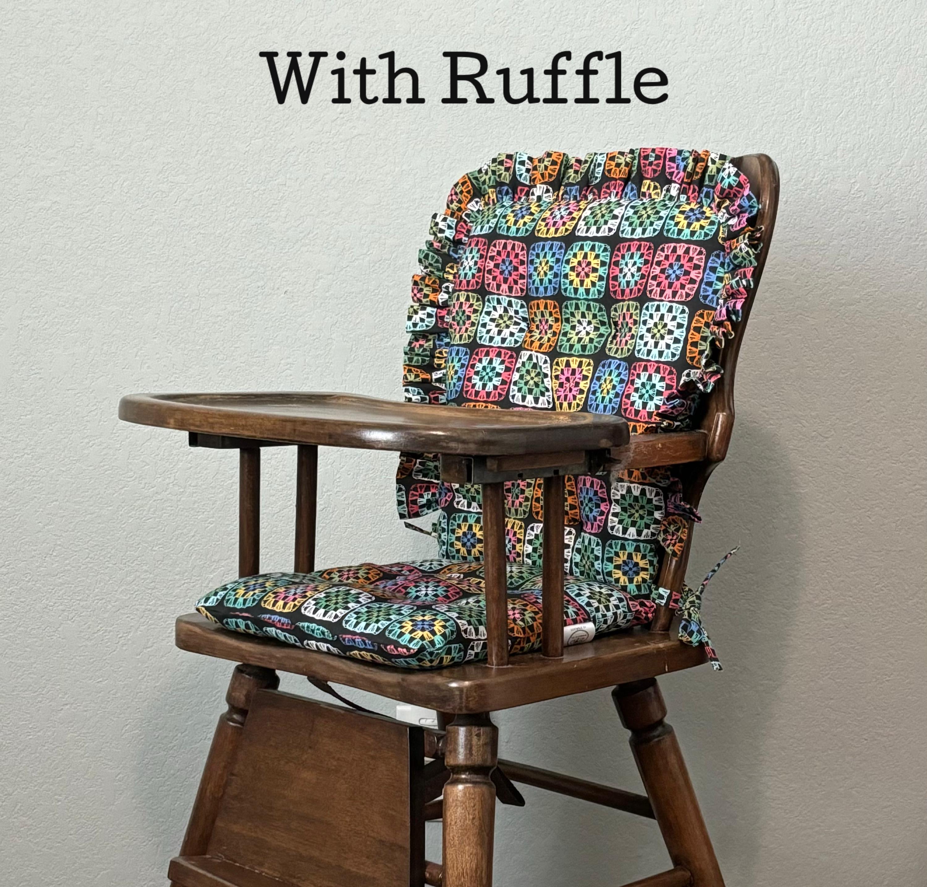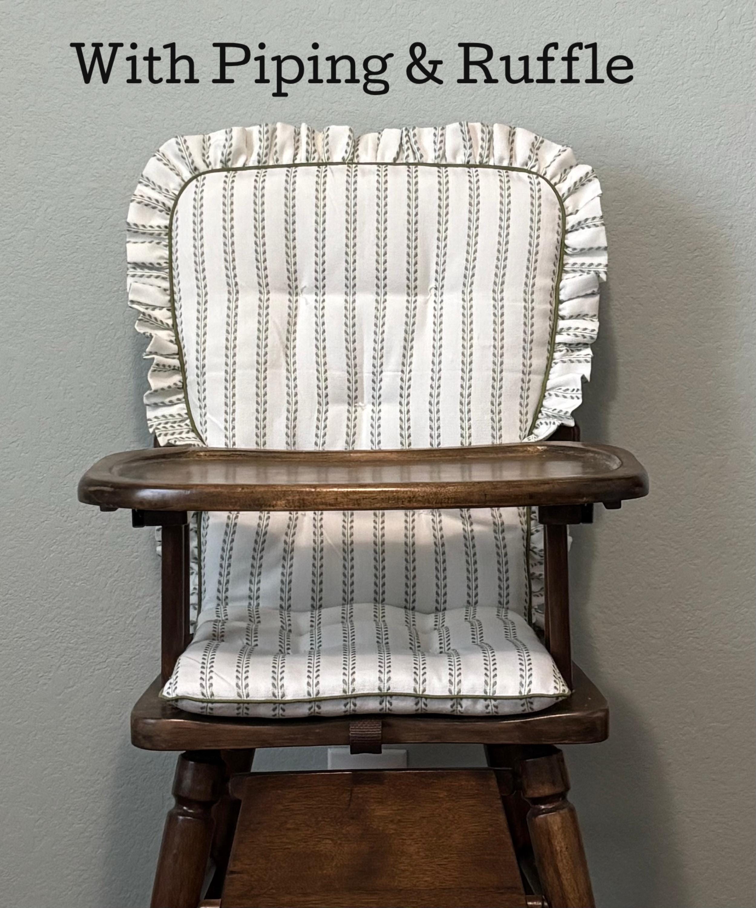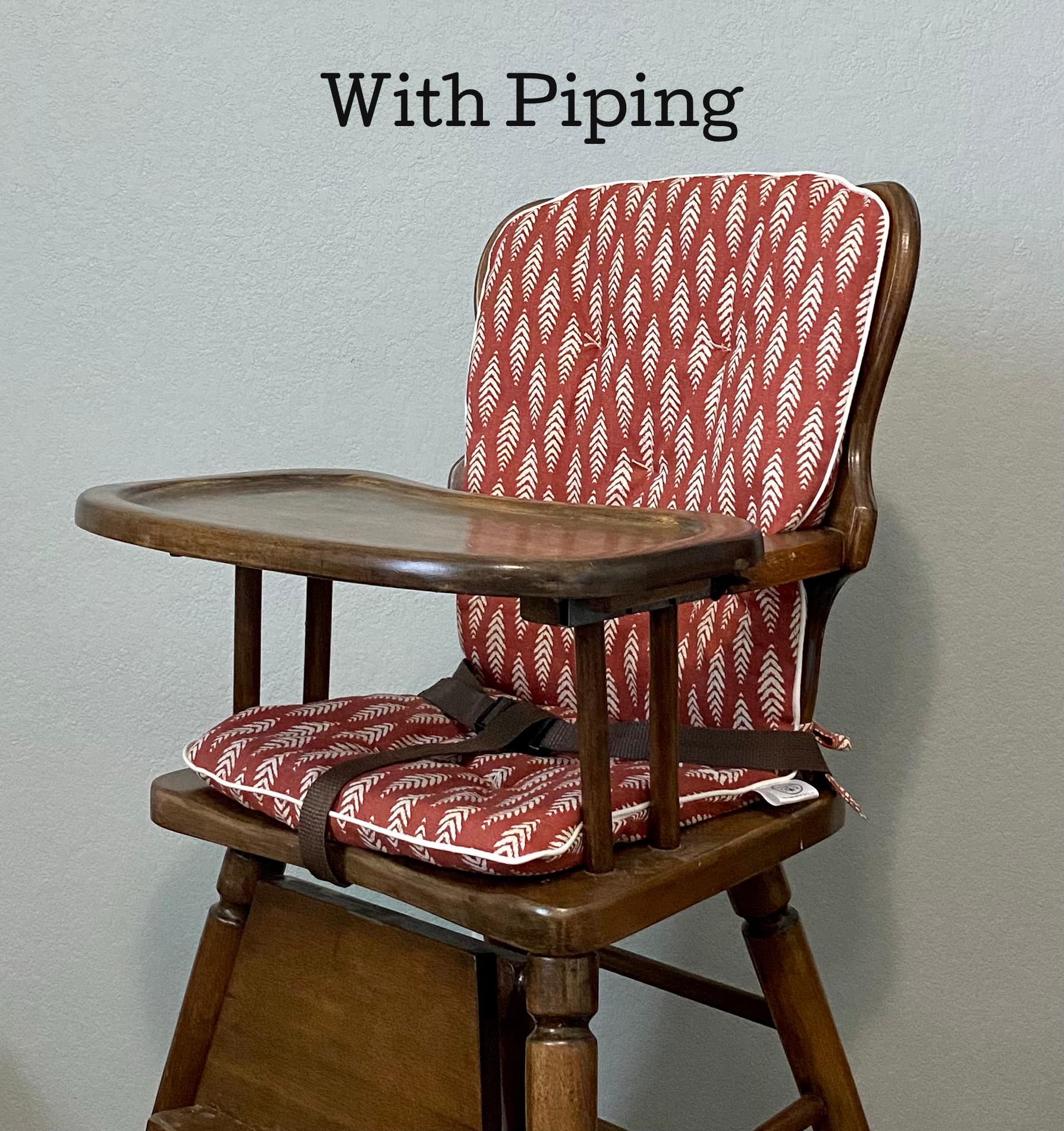 Custom, made to order, cushions for your vintage wooden highchair, in your choice of fabrics. Choose the same fabric or two coordinating patterns for the reversible sides. Choose from otional piping, ruffle, or both! (If choosing two fabrics, please add a message with second fabric choice.) 66 fabrics to select from. Don’t see a fabric you like? Contact us and we will help find the perfect fabric to coordinate with your home decor; or, send us 1-yard of your own fabric.